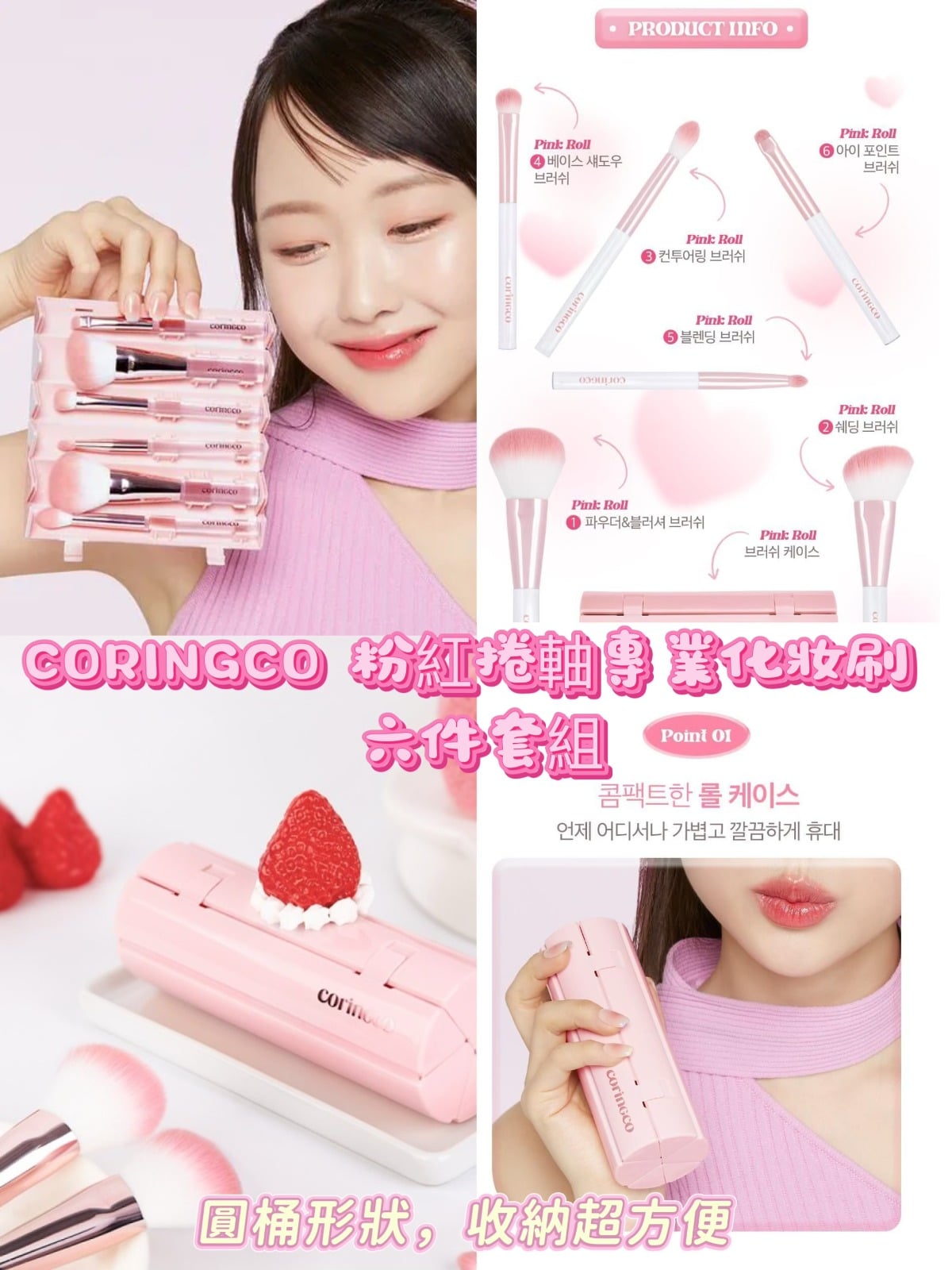 【韓國 CORINGCO 粉紅捲軸專業化妝刷6件套】