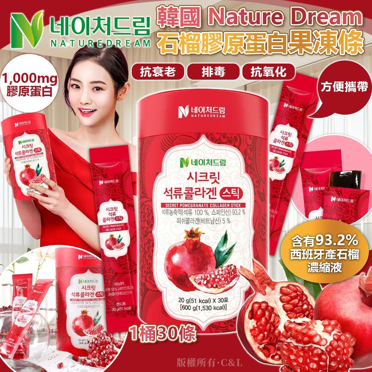 【韓國 Nature Dream 石榴膠原蛋白果凍條 (1桶30條)】