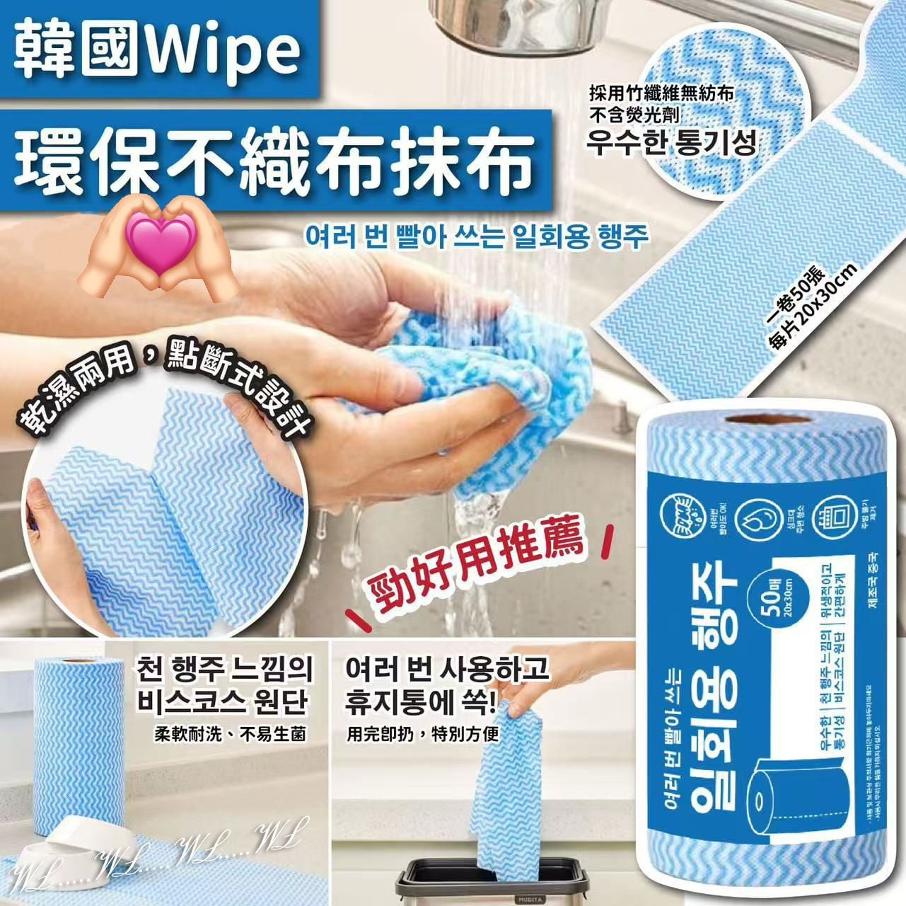韓國加厚 Wipe 廚房多用途環保不織布抹布 (1套5卷)