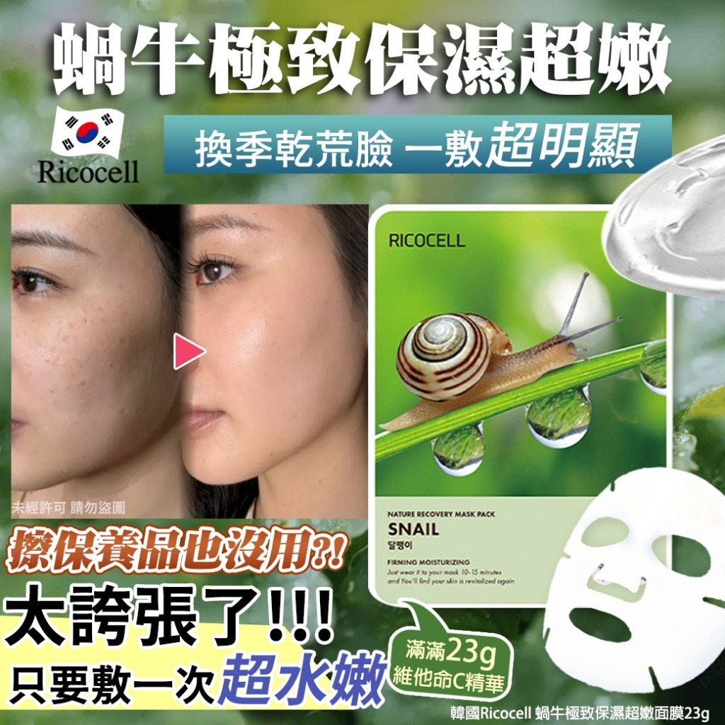 韓國 Ricocell 蝸牛極致保濕超嫩面膜 23g (1套20片)