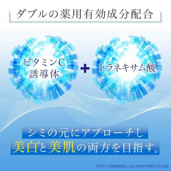 本產品含有雙重活性藥用成分(維生素C衍生物+氨甲環酸)能深入角質層,有效改善以上女性皮膚問題,抑制黑色素生成,美白肌膚,同時護理皮膚瑕疵。